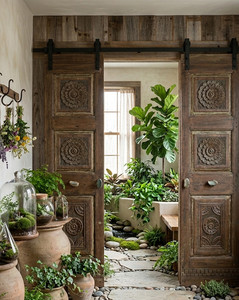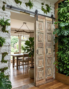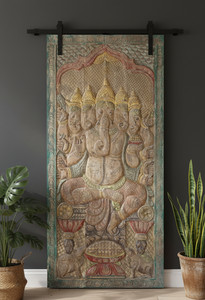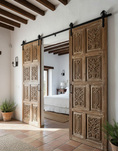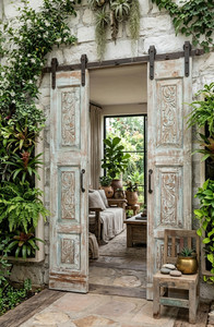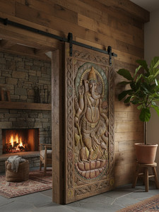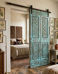At the center of the transformation are antique carved wood doors from Mogul Interior, whose intricate detailing sets the tone for the entire space. Their hand-carved patterns and aged patina bring depth and authenticity, creating a striking architectural feature that immediately draws the eye. These doors act as both functional elements and statement pieces, grounding the home in craftsmanship while allowing the surrounding décor to explore bolder colors and textures. Shop At Ebay Mogulgallery
