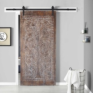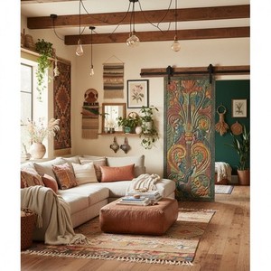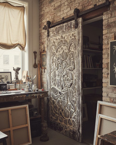 The journey into the house begins where all great journeys should: at the threshold. The entrance hall rises to a dramatic double-height apex, its soaring roofline drawing the eye upward before the rest of the room even registers. But it is the doors that stop you in your tracks. Massive, fortress-worthy, and sourced from India, they carry the weight of another world — another century, even — worn smooth by time and rich with the kind of patina that no new material can replicate. Shop At Ebay Mogulgallery